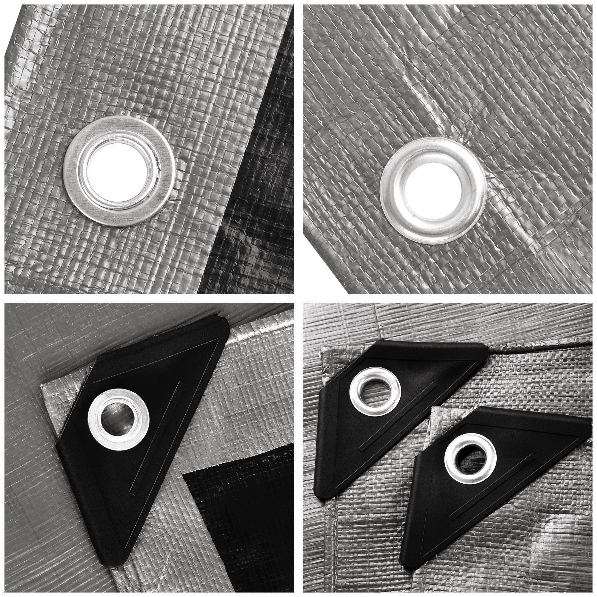 - Heavy Duty Sturdy Poly Tarp - Weights 14.59Lbs; 10mil heavy-duty thickness and aluminum grommets in 3 1/4 ft (1m) interval for better tear-resistance; PP plastics capped reinforced corners with grommets for sturdy construction; All seamless edges avoid water leakage