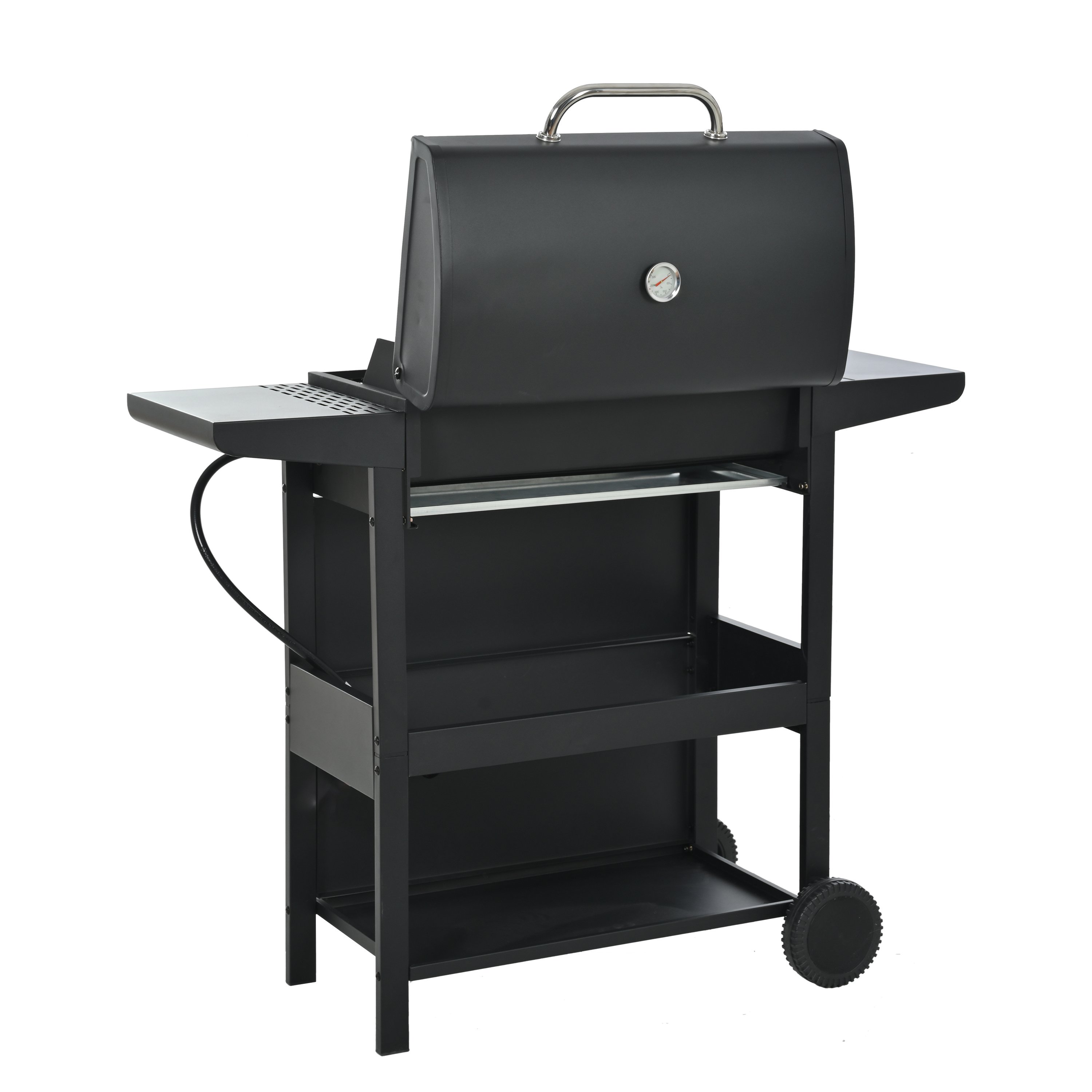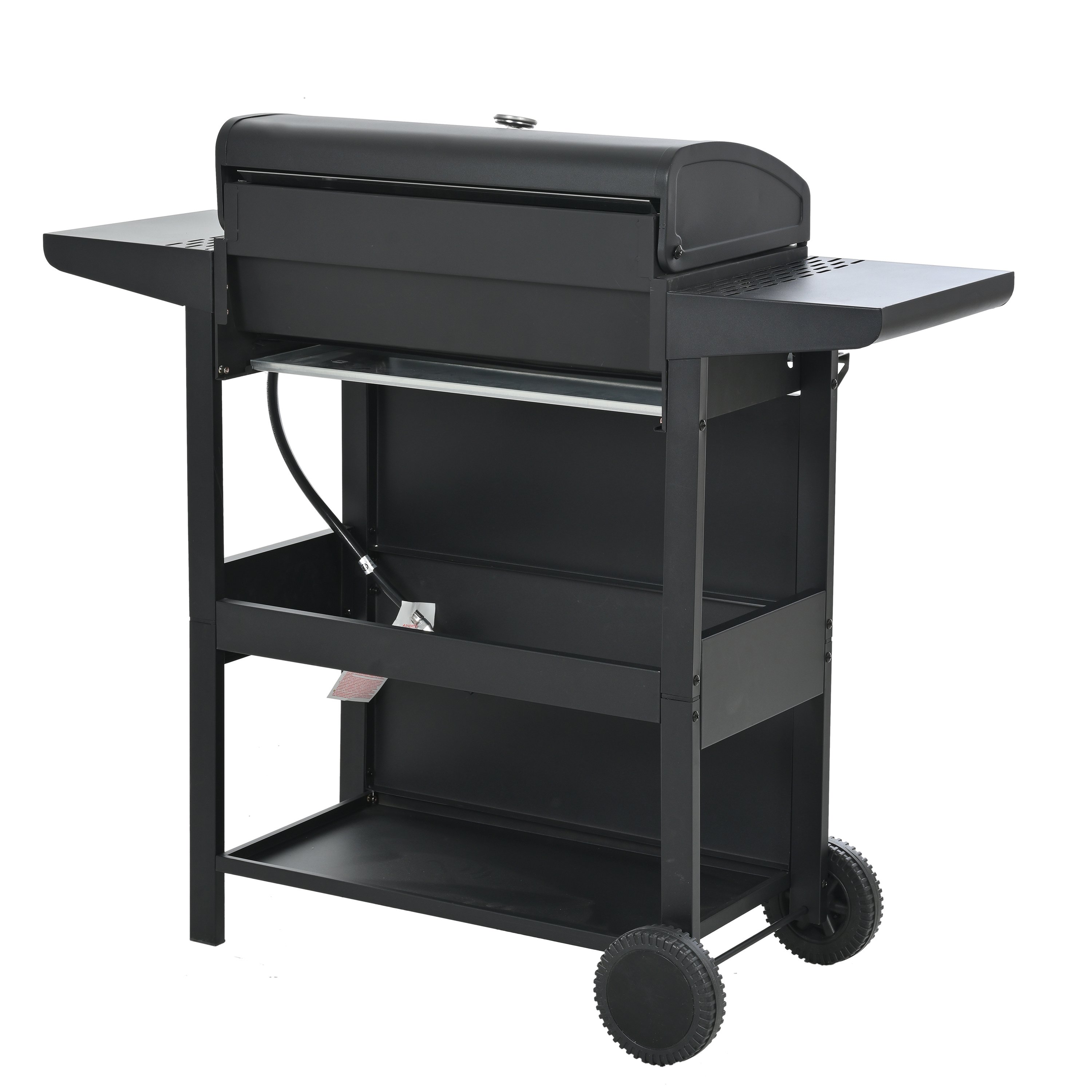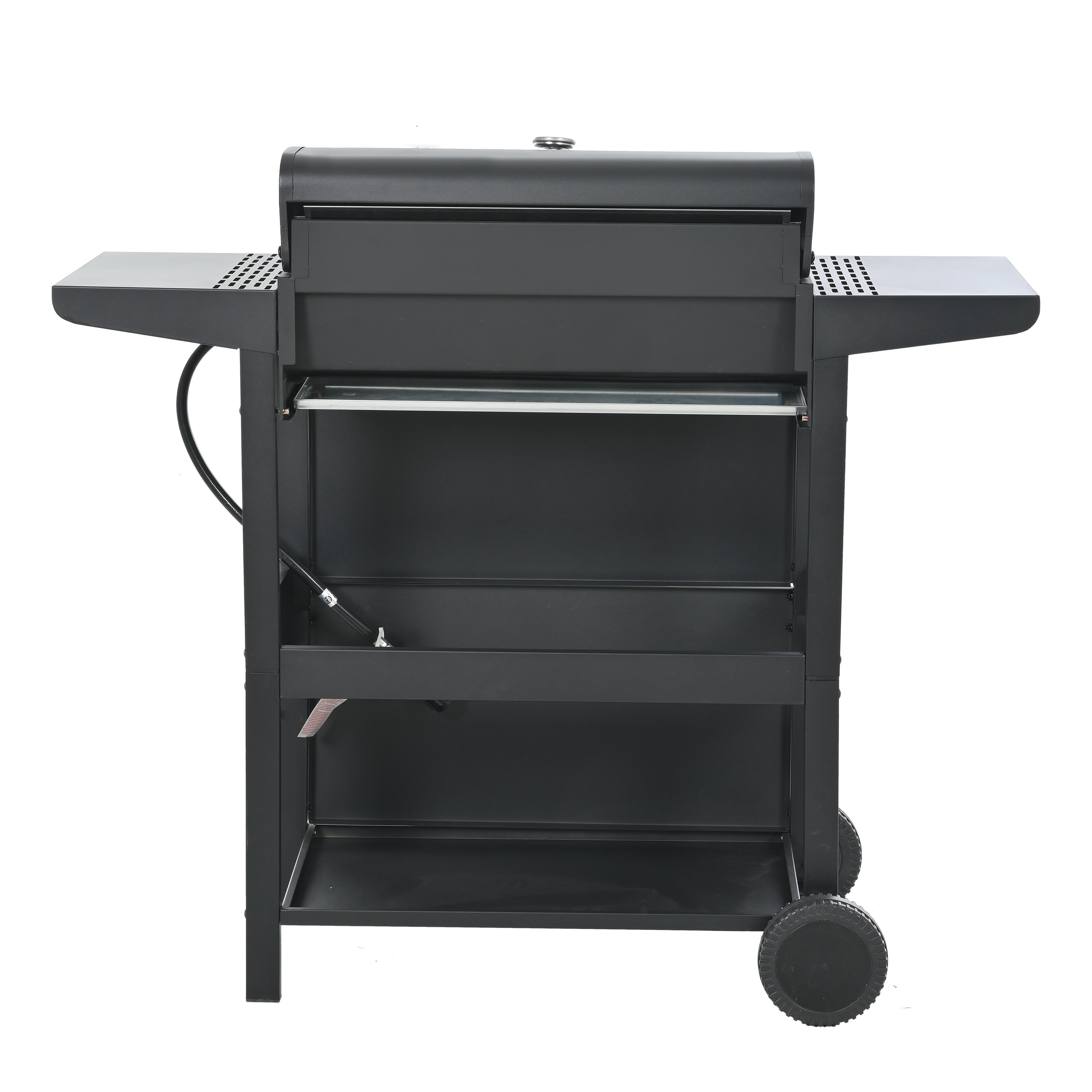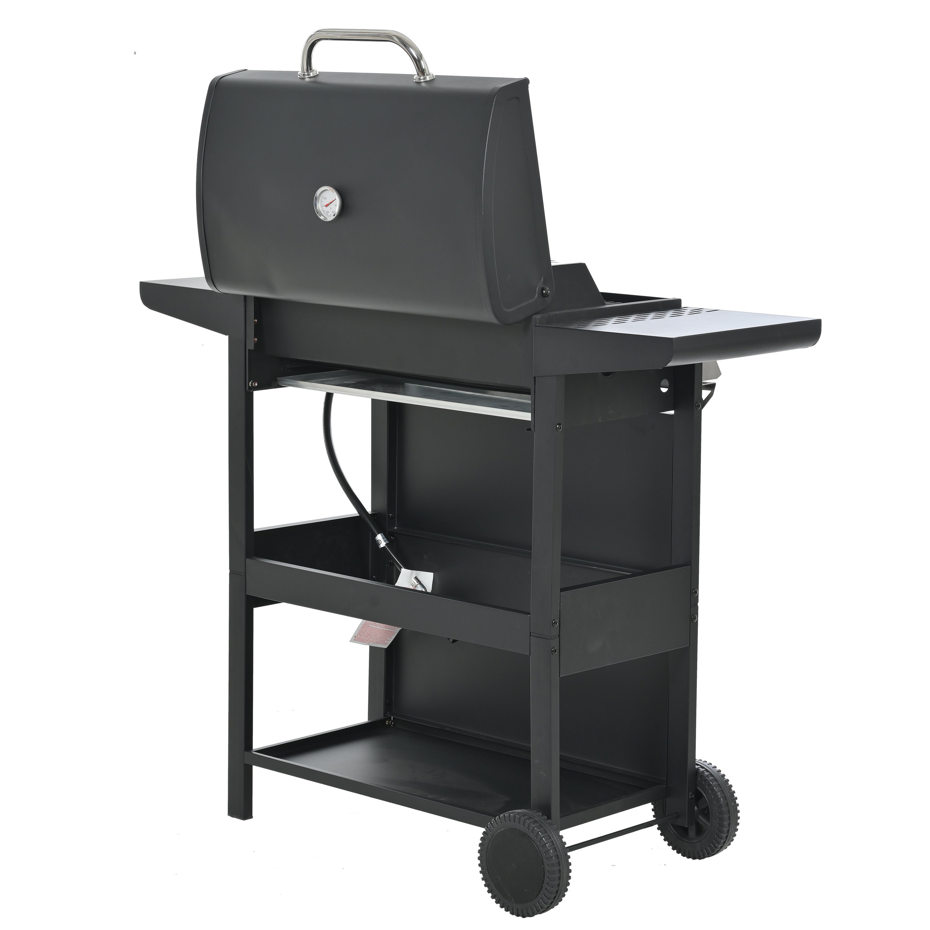 The whole Stainless steel control panel with chromium plating control knob makes this propane gas grill more study and delicate, a stainless steel handle and a built-in stainless steel thermometer on the cover lid, two tables and two wheel casters for storage and moving