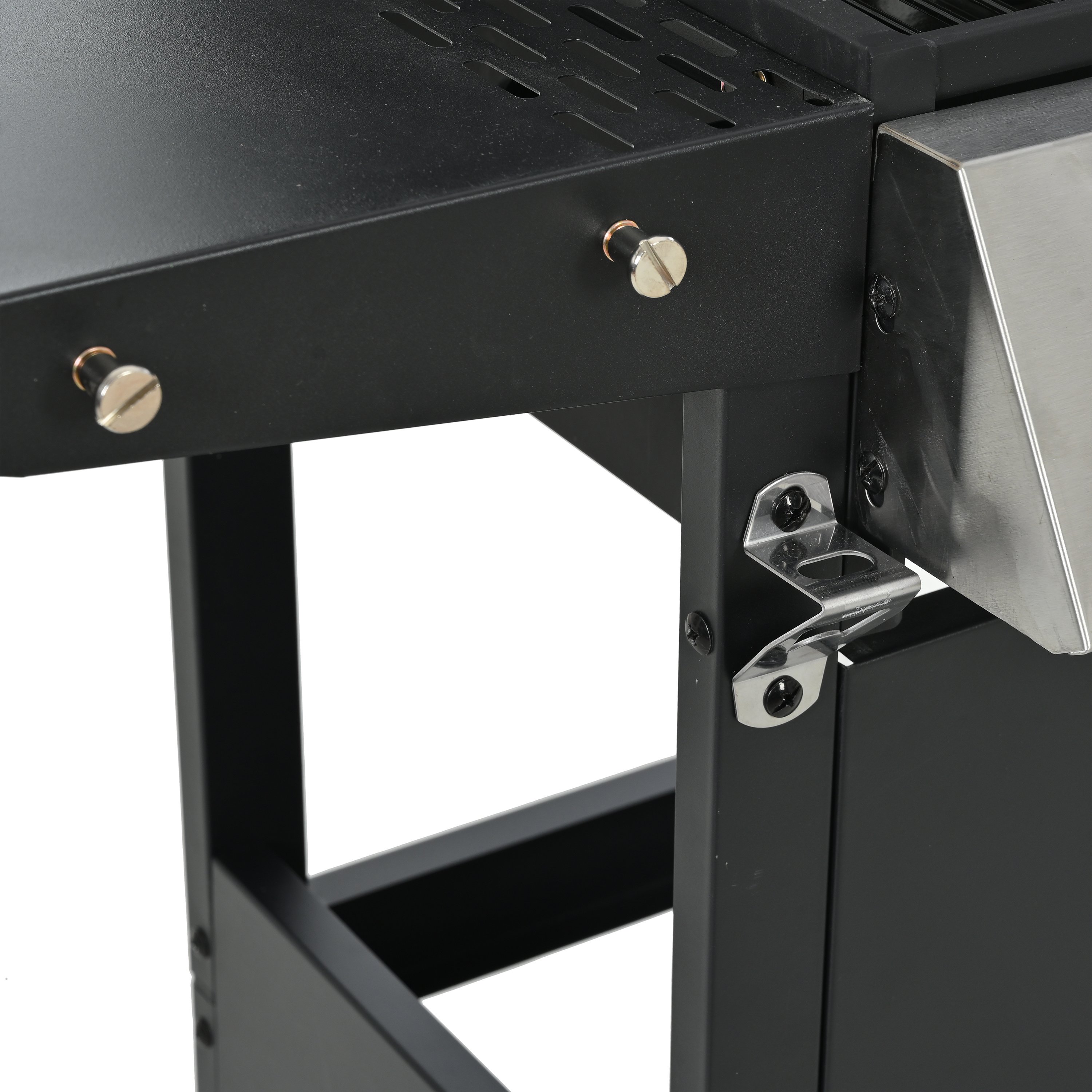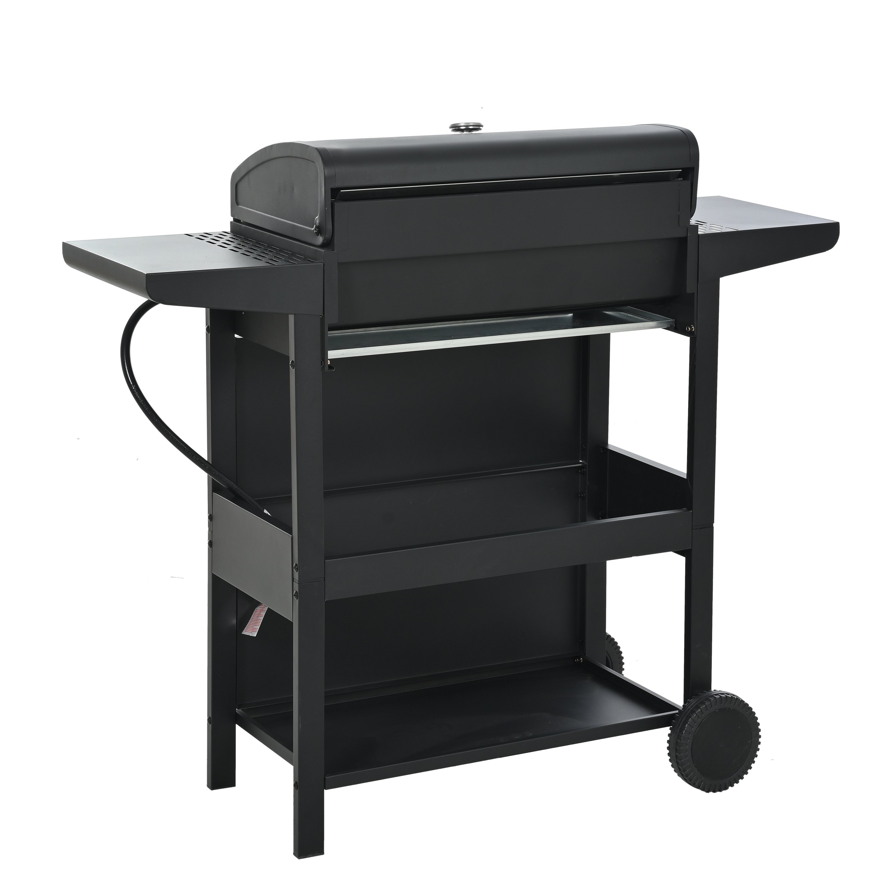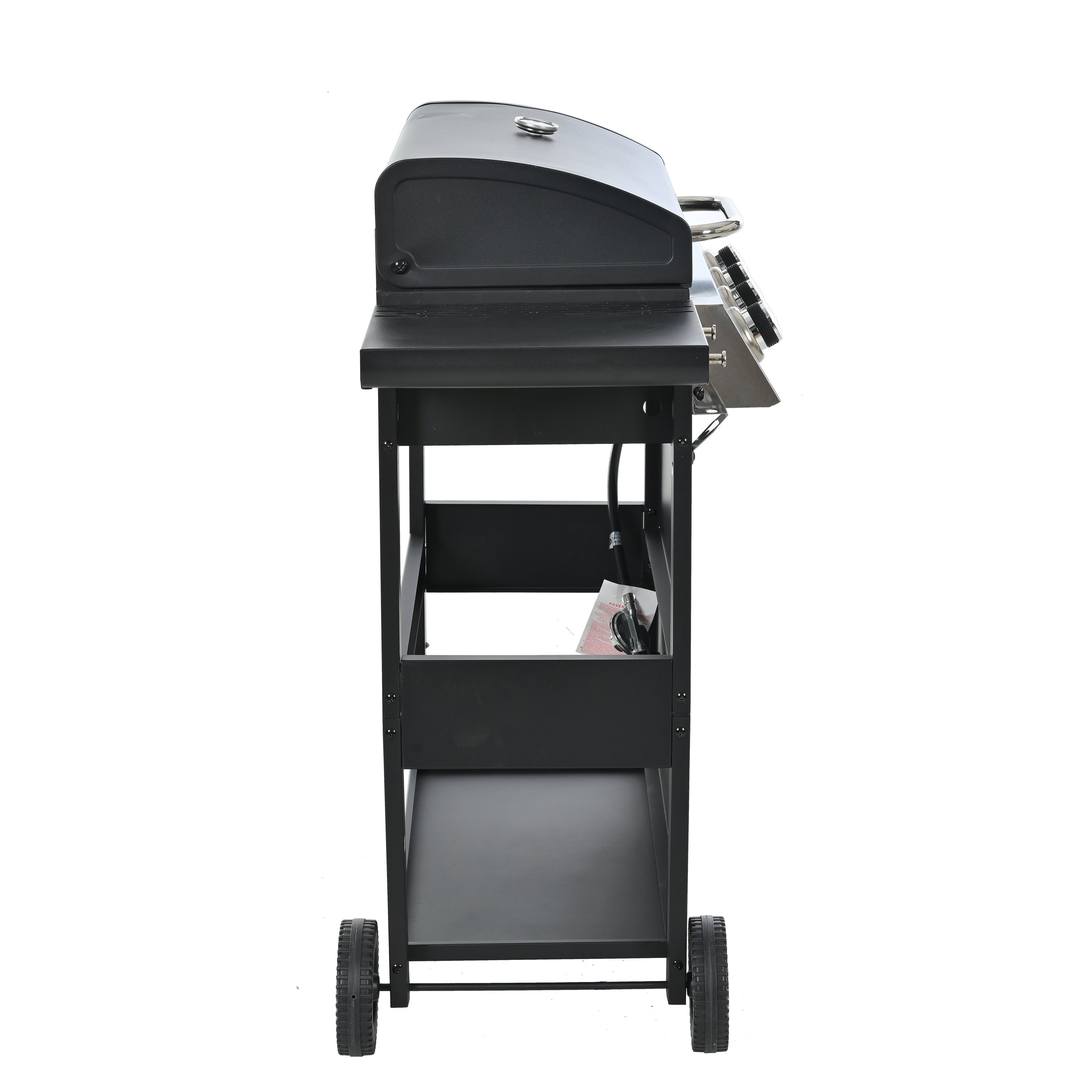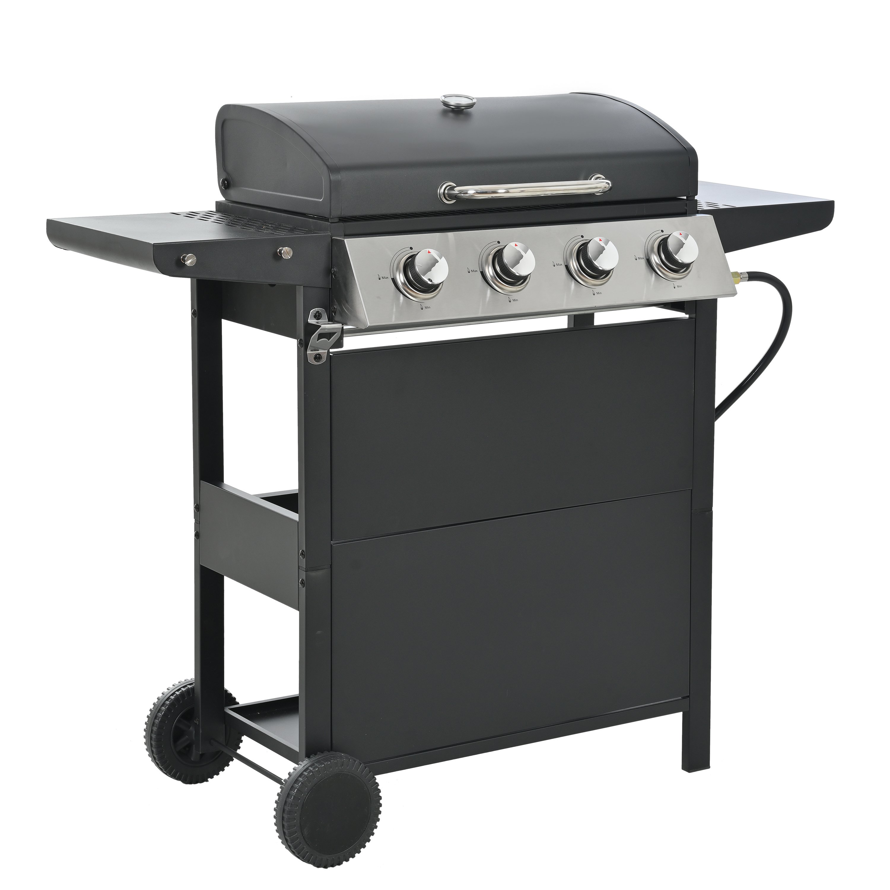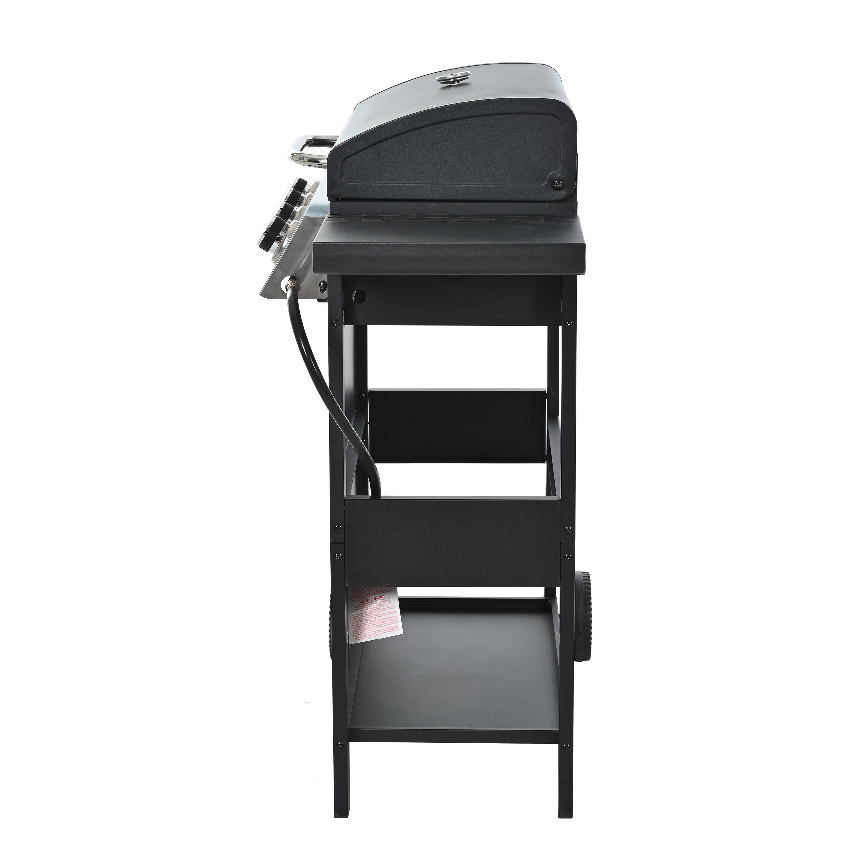 The whole Stainless steel control panel with chromium plating control knob makes this propane gas grill more study and delicate, a stainless steel handle and a built-in stainless steel thermometer on the cover lid, two tables and two wheel casters for storage and moving