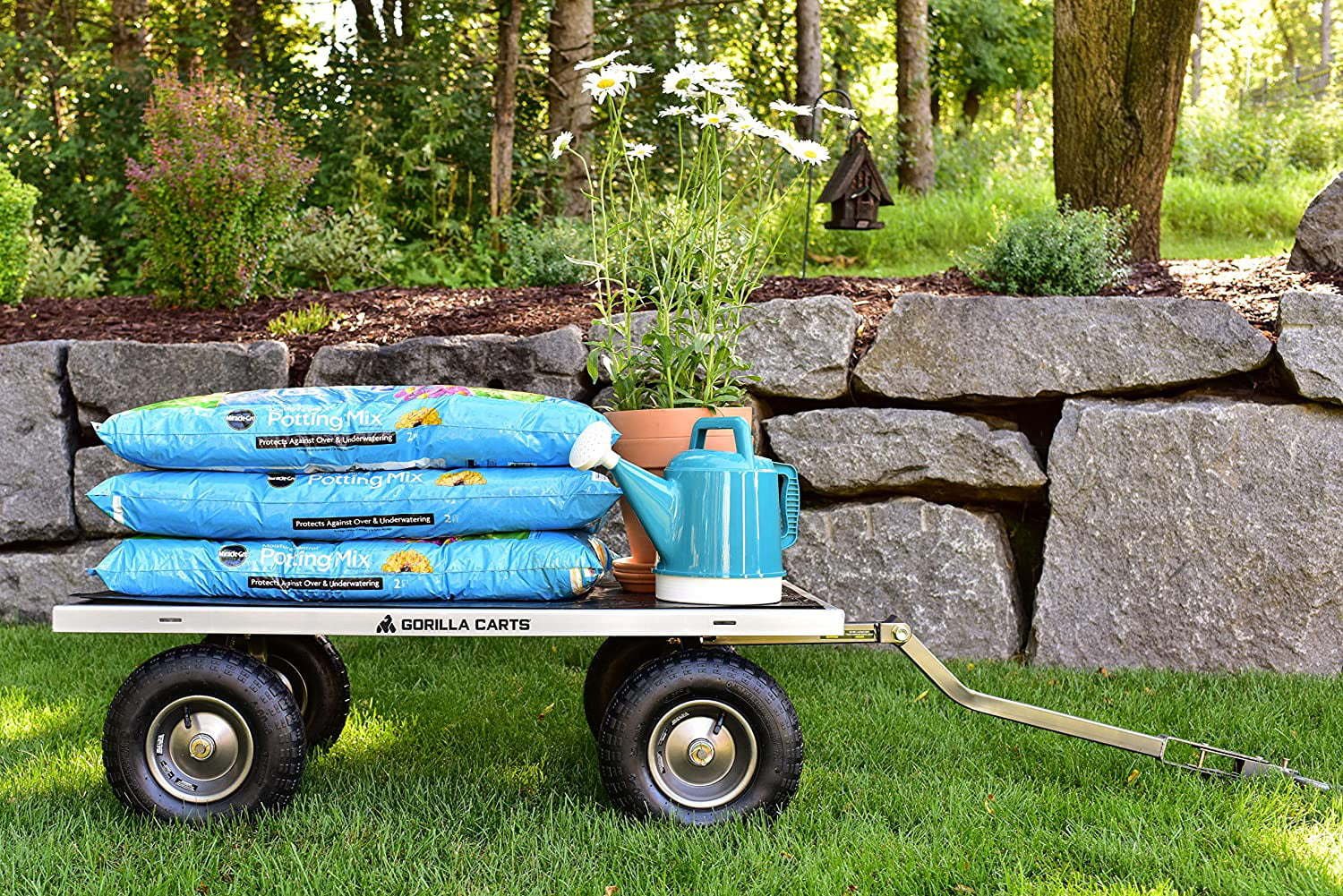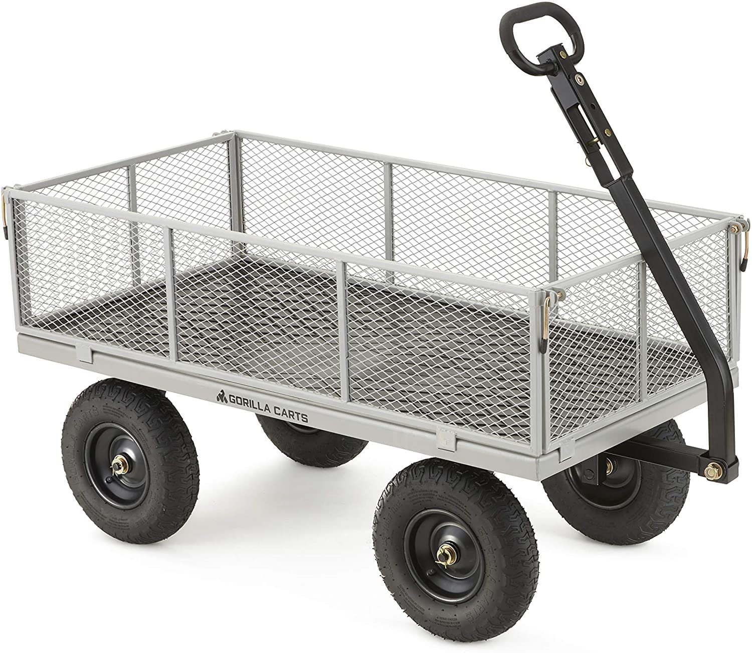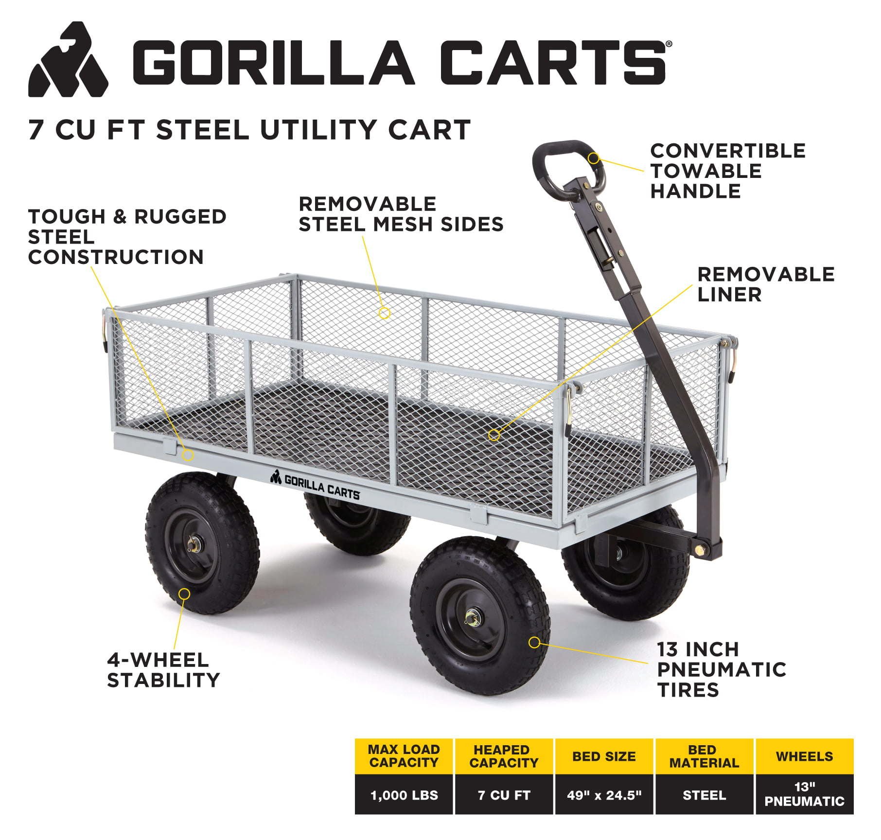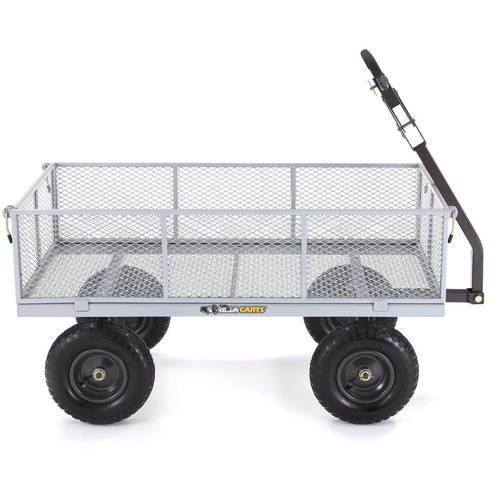 The newly-designed Heavy-Duty Steel Utility Cart has been engineered to significantly reduce assembly times, making it quick and easy to put this cart to work. The new frame design improves maneuverability, increases ground clearance, and gives the cart a tighter turn radius, making it easy to move up to 1,000-pounds for gardening, farming, or any other outdoor jobs. The durable steel bed features removable sides that allow the cart to convert into a flatbed for moving larger materials like 2x4s, tree branches, or fence posts. The 13-inch pneumatic turf tires are designed to tackle any terrain, and the convertible 2-in-1 handle makes it simple to switch between pulling the cart by hand or towing behind a lawn tractor. Whether you're an experienced farmer, a casual gardener or an occasional do-it-yourselfer, this utility cart will ensure that your outdoor projects go off without a hitch. The bed dimensions measure 49-inches by 24.5-inches, and the cart has an overall height of 44.1-inches and weighs 61.3-pounds. full line of products meets the needs of the light-duty homeowner as well as the commercial-duty professional user by offering a wide variety of carts in many sizes and weight capacities. The GOR1001 Heavy-Duty Steel Utility Cart comes with a 1-year limited warranty.