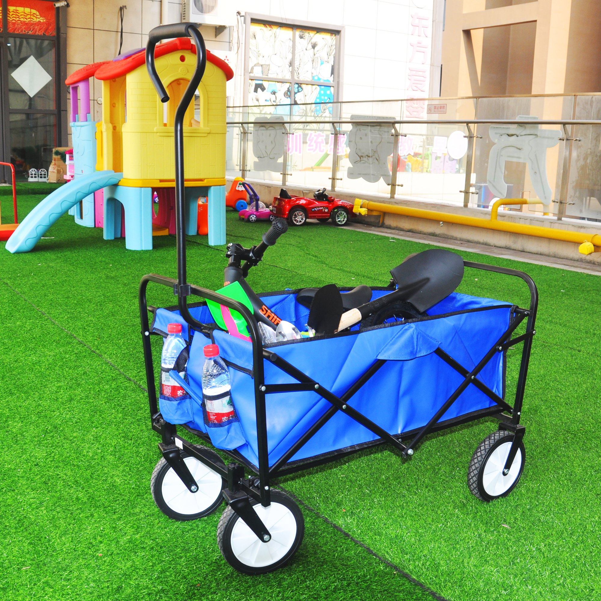 [Lots of Room]The outdoor utility wagon features the biggest bang for your buck. This large interior measures out to a capacity of 35.5" x 18.11" x 11". The utility wagon also folds out to its full size in a matter of seconds with no assembly required.[Heavy Duty]The wagon was built to last. The wagon is built using durable 600 Denier fabric. The heavy duty frame allows you to carry up to 150 pounds of gear with ease. Think of all the trips to and from the car you will save.[Functional Features]All utility wagons come with an adjustable handle for effortless transport across multiple surfaces (pavement; grass; etc.) It also comes with 2 mesh cup holders to keep your beverages safe and sound.[HIGH QUALITY]The utility wagon cart is made of strong steel and iron frame; fixed handle is firm and practical; rubber wheel is suitable for hard road and beach. Durable and waterproof 600D Oxford cloth is easy to clean and has a long service life.[WIDE RANGE APPLICATIONS]Folding utility wagons are used in a wide range of applications; such as outdoor activities; beaches; gardens; parks; camping or shopping to make your life more convenient.